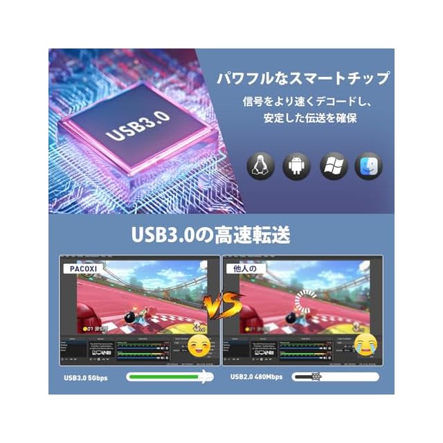 【USB3.0高速伝送】ゲームキャプチャーは、USB3.0インターフェースを通じて高速データ伝送を実現し、最大伝送速度は毎秒5Gbpsです。Twitch、YouTube、OBS、PotPlayer、XSplit、QuickTime Playerなどのプラットフォームでのライブ配信と録画に適しており、ゲームとビデオ録画中にほとんど遅延がありません