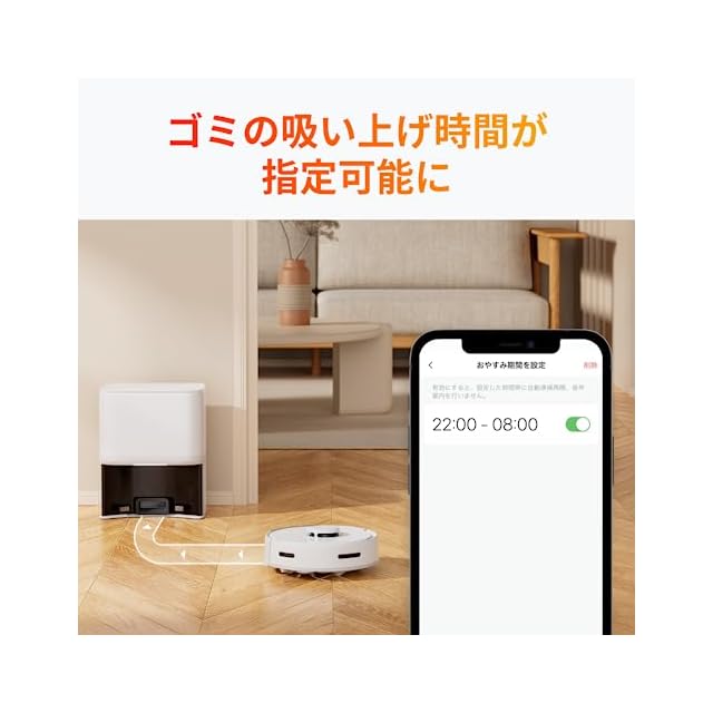 【おやすみモードで使いやすい】「おやすみモード」を搭載し、ゴミ吸引時間を指定できます。家族やご近所さんが不在の時間に指定することで、ゴミ自動収集ステーションの作動音を気にせず利用できます。SwitchBot開閉センサーと併用すれば、外出を自動検知してゴミ収集が作動する上級技も!