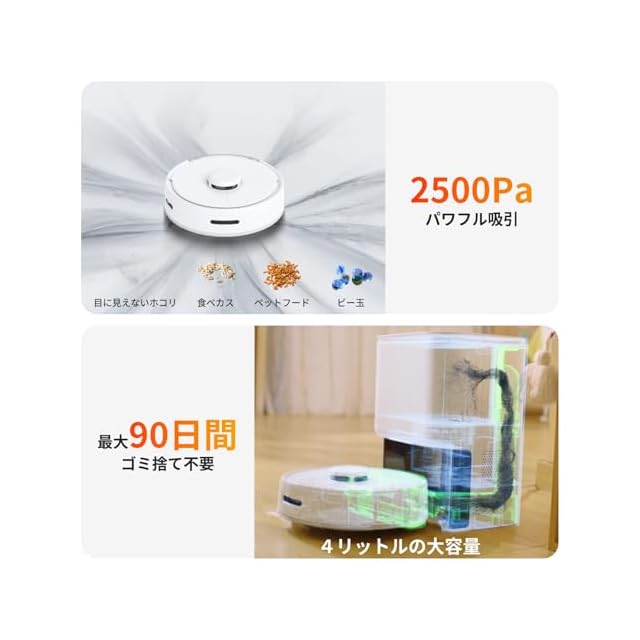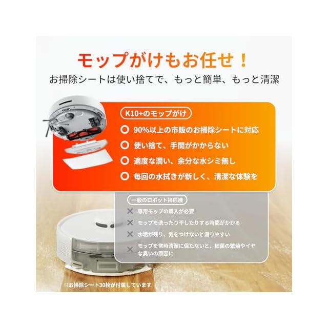 【自動ゴミ収集機能&水拭き】4リットル大容量ダストバッグで、最大70日間ゴミを触らなくてよい。ホコリや髪の毛に触れたくない人も安心してご使用いただけます。また、使い捨て床拭きシートを使用して、モップ洗いの手間を省けます。市販の使い捨ての床拭きシートを利用可能!モップ洗いの手間は一切かかりません。これでモップに関するお悩みや、生乾きの嫌な臭いも一掃!