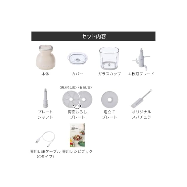コードレスで場所を選ばず使える、コンパクトでパワフルなフードプロセッサー。 ガラス製のカップは、食材が飛び散らないカバー付きで、液体の撹拌も可能。 "刻む・混ぜる・砕く・練る・つぶす・鬼おろし・おろし・泡立てる"の1台8役をこなします。 ◆USB充電式&コードレス コードを気にせずどこでも使えるUSB充電式。10分の充電で約1分使えるから、うっかり充電し忘れていても、他の作業をしながらさっと充電できます。充電口は汎用性の高いUSBタイプC。 ◆上質感のあるガラス製カップ においも色も移りにくいガラス製カップは料理のおいしさを邪魔せず、食器のようにすっきり洗えます。 ◆フードプロセッサーなのに液体も撹拌できるから、なめらかなスムージーも シリコンパッキン付きのカバーが液もれもしっかり防ぐから、スムージーやフレッシュジュースも作れます。 ◆小型でもパワフル。秒で刻める4枚刃ブレード 高さが違う4枚の刃が高速回転することで、あっという間にみじん切り。ブロック肉もかんたんにひき肉にできます。市販のかたい氷もしっかり砕けるので、クラッシュアイスやかき氷なども楽しめます。 ◆2種類の大根おろしが作れる両面おろしプレート おろし目の粗さが表裏で違う両面仕様プレート。ザクザクの鬼おろしが約5秒、ふわシャキの大根おろしが約30秒と手でおろすよりも断然ラクに、たっぷり作れます。 ◆泡立てプレート 生クリームは約30秒※でふわふわ。 ボウルを使わずに泡立てられるので、まわりに飛び散ることもありません。 ※乳脂肪分35%の生クリーム(200ml)を泡立てた場合 ◆本体以はすべて水洗い可能 汚れが気になるカバーのパッキンも取り外してすっきり洗えます。間口が広いカップはすみずみまで洗いやすくお手入れかんたん。 ◆バリエーション豊かな専用レシピブックが付属 雑誌やTVで活躍する人気料理家・エダジュンさん監修の絶品ハンバーグやチョップドサラダ、ジェラートなど、多彩な全32レシピを掲載。