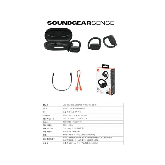 商品名:JBL SOUNDGEAR SENSE 完全ワイヤレスイヤホン/オープンイヤー/マルチポイント/IP54防水/Bluetooth5.3/耳を塞がない/音漏れ防止/ブラック/JBLSNDGEARSNSBLK