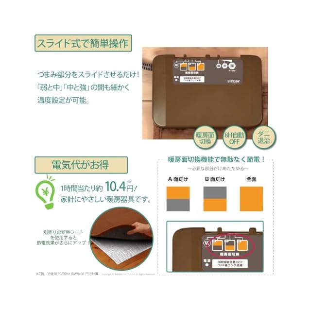 【多彩な機能のコントローラー】全体を温めるだけでなく、 A面とB面を切り替える機能がついています。 必要な箇所だけ温めたいときに、この機能を使うと省エネになります。 また、電源オンから約8時間後に自動的に通電が止まる自動OFF機能搭載。 電源切り忘れを防止する安心設計です。