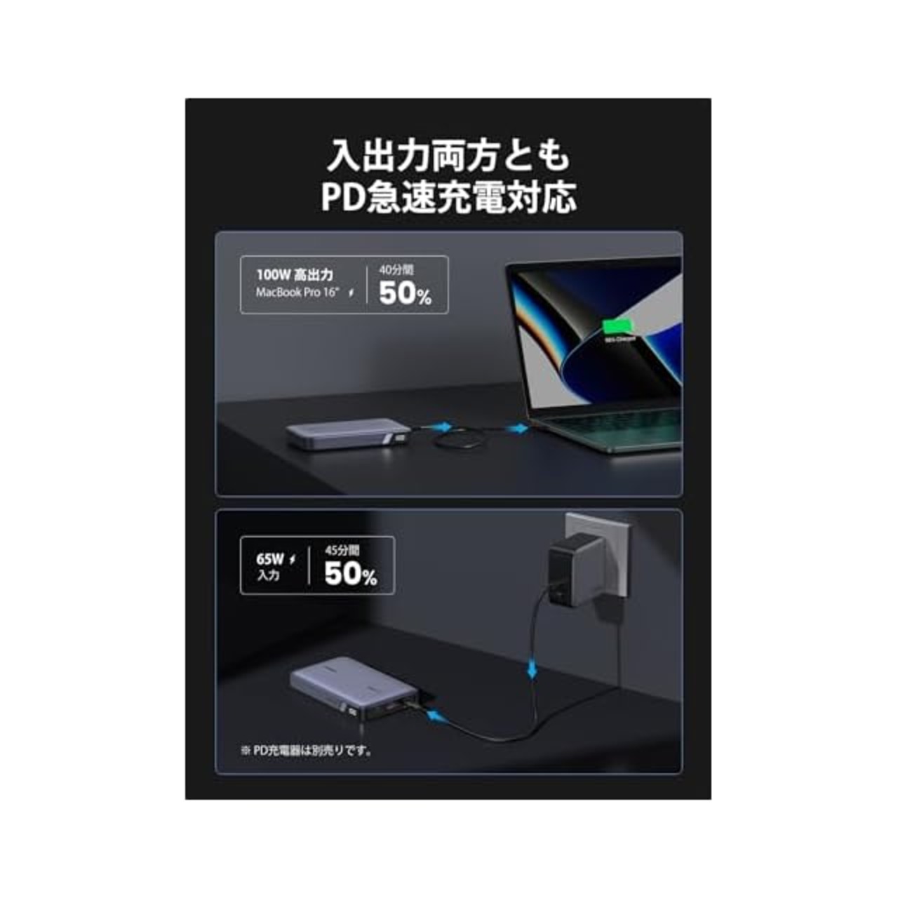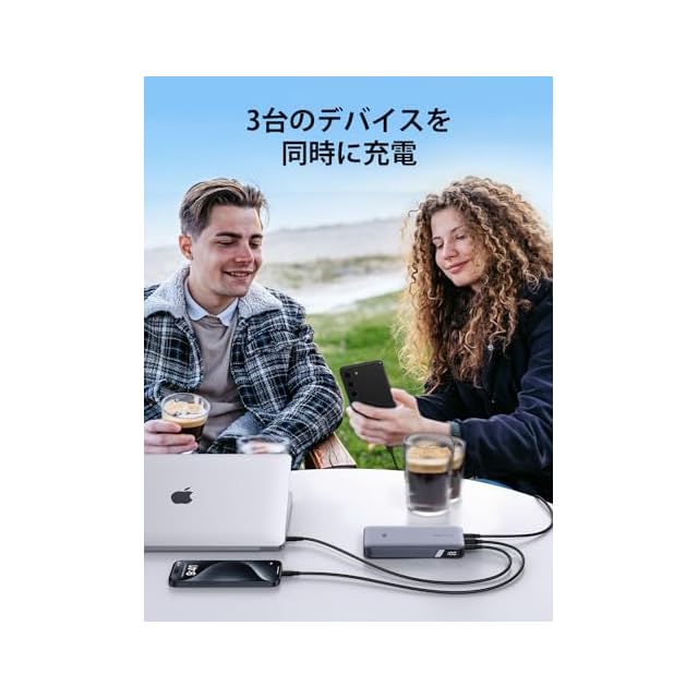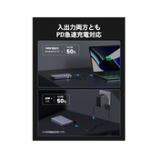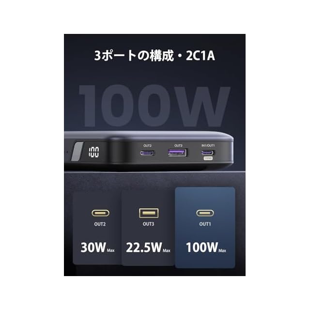 【★ 単一ポート100W高出力・ノートPCにも急速充電 ★】Power Delivery対応のUSB Type-Cポートを2つ搭載、USB-C1は100Wの高出力仕様で、MacBook ProなどのノートPCにも急速充電できます。スマホやノートPCを持って移動の多い人に相応しいPD モバイルバッテリーです。