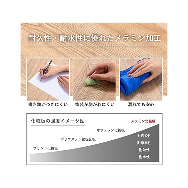 【高強度メラミン加工】メラミンで表面を加工し、水や汚れ、傷に強く、汚れた時もサッと簡単に拭くことができお手入れも簡単です。パーティクルボードを使用しているため、耐久性を保ちつつ軽量化を実現しました。