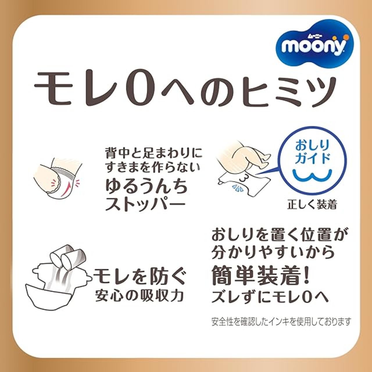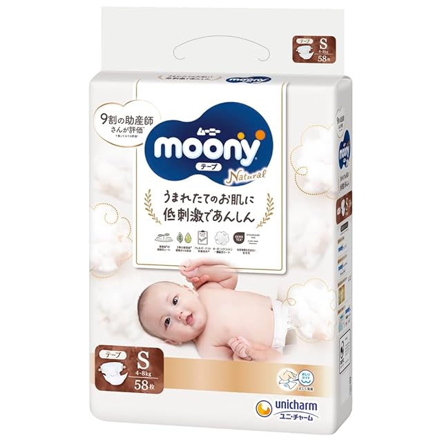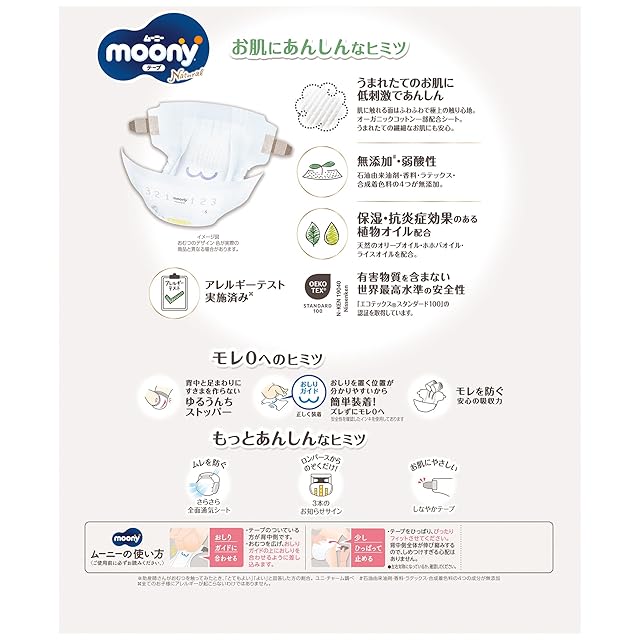 ユニ・チャーム ナチュラルムーニー(テープタイプ) Sサイズ 4~8kg日本初!※オーガニックコットン配合表面シートのナチュラルムーニーシリーズが大改良!柔らかい肌触りの「オーガニックコットン配合表面シート」で、生まれたての赤ちゃんのお肌に安心です。「無添加#&弱酸性」仕様のシートが赤ちゃんのお肌をやさしく包みます。凹凸構造のゆるうんち吸収ゾーンがゆるうんちをしっかりキャッチし、ゆるうんちによる肌かぶれの一因が減って、赤ちゃんのお肌に安心です。※日本国内の主要ベビー紙おむつの表面シートにおいて。2016年ユニ・チャーム調べ #石油由来油剤・香料・ラテックス・合成着色料の4つの成分が無添加 【ベビー用品・赤ちゃん用品・おむつ・オムツ】