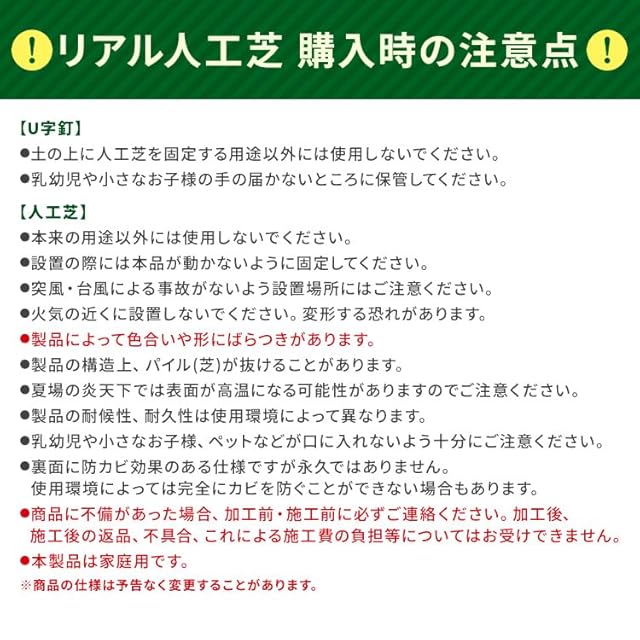 ※2025年4月3日:一部仕様(U字釘の色)リニューアルしました。 変更前:シルバー 変更後:グリーン 在庫の都合上、リニューアル前・後の商品が前後してお届けとなる場合がございます。予めご了承ください。お庭やベランダなど、広い場所にも敷きやすく、継ぎ目が目立ちにくい人工芝です。