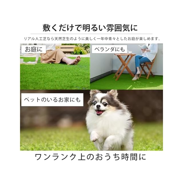 ハリ・コシがあり、クッション性に優れているので、お子さまやペットの遊び場・ドッグランにもおすすめ!ベランダに敷くだけで明るい雰囲気に!またカーペットやインテリアグリーンとしても。