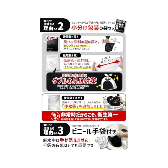 【ポリ袋セットへのこだわり】POINT①便器袋:非常時だからこそ、衛生第一。処理が格段に楽になります。 POINT②排泄袋:耐久性と伸縮性が推し。様々な実験から「PEポリエチレン製」を採用。 POINT③処理袋:厚さ0.03mm(一般的には0.01mmを使用)の肉厚仕様で防臭強化。