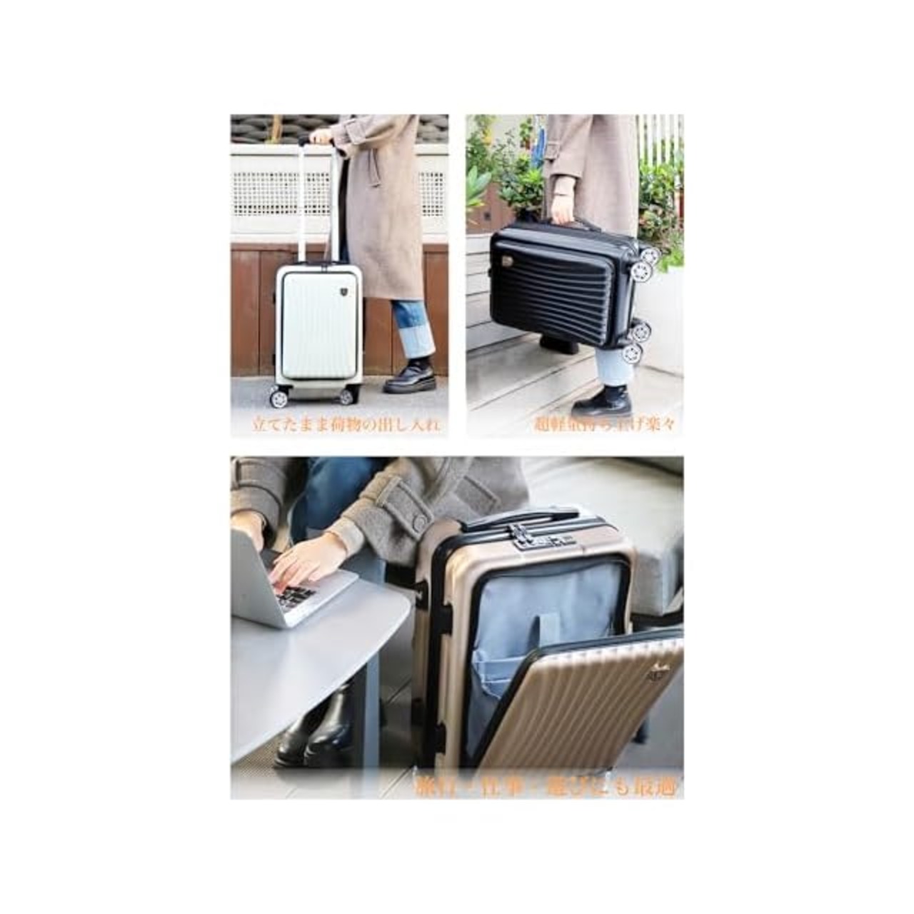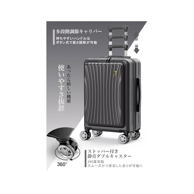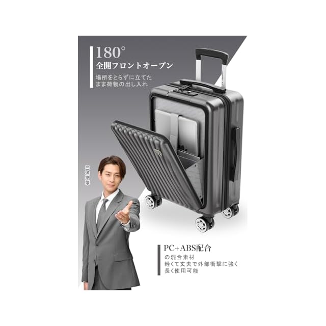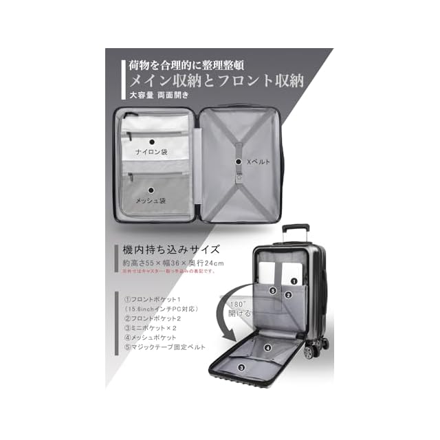 商品タイプ:立ったまま荷物の出し入れが便利なフロントオープンスーツケース。15.6インチPC収納可能、細かなポケット付き。旅中でも前ポケットから簡単に取り出し可能。USB充電ポート付きでいつでも充電可能。