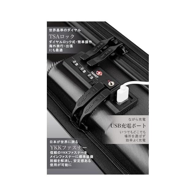 【高品質なボディ&信頼のYKKファスナー】PC(ポリカーボネート)樹脂は耐衝撃性・断熱材に優れる、ABS樹脂は軽くて弾力性と割れに強く、両素材を混合した耐久性が高いハードタイプの高品質ボディを実現しています。また、日本が世界に誇るYKKファスナーをメインファスナーに標準装備。ファスナータイプのスーツケースによくあるファスナーの不具合(ファスナー脱線や開き)を解消し、長期にわたり安定した使用感が可能となりました。