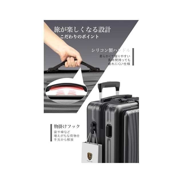 【多段調節キャリバー&ストッパー付き静音ダブルキャスター】アルミ合金製の超軽量のキャリバーは伸縮可能で、ご自分の身長に合わせて、最適な高さに調節できます。360度回転可能の8輪ダブルキャスターは、静音と耐久性抜群で、凸凹道でもスムーズに走ることができます。また、ストッパーが付いているため、坂道や電車内などスーツケースを止めたい時に便利です。キャリーケースのボディ側面に手提げ袋など掛けられるフックを搭載しています。外出中増えがちな荷物を、手持ちから解放してくれる便利機能です。