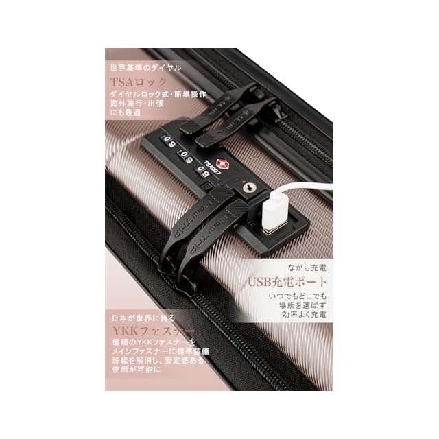 【高品質なボディ&信頼のYKKファスナー】PC(ポリカーボネート)樹脂は耐衝撃性・断熱材に優れる、ABS樹脂は軽くて弾力性と割れに強く、両素材を混合した耐久性が高いハードタイプの高品質ボディを実現しています。また、日本が世界に誇るYKKファスナーをメインファスナーに標準装備。ファスナータイプのスーツケースによくあるファスナーの不具合(ファスナー脱線や開き)を解消し、長期にわたり安定した使用感が可能となりました。