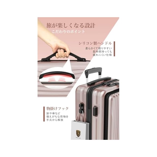 【多段調節キャリバー&ストッパー付き静音ダブルキャスター】アルミ合金製の超軽量のキャリバーは伸縮可能で、ご自分の身長に合わせて、最適な高さに調節できます。360度回転可能の8輪ダブルキャスターは、静音と耐久性抜群で、凸凹道でもスムーズに走ることができます。また、ストッパーが付いているため、坂道や電車内などスーツケースを止めたい時に便利です。キャリーケースのボディ側面に手提げ袋など掛けられるフックを搭載しています。外出中増えがちな荷物を、手持ちから解放してくれる便利機能です。