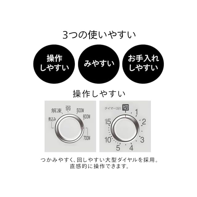 【大型ダイヤルで さらに合わせやすく。】大型のダイヤルを2つ配置。タイマーは使用頻度の高い5分までを幅広く取りました。出力はハイパワー700W。料理の温めなおしはもちろん、解凍やお料理などにも幅広くお使いいただけます。