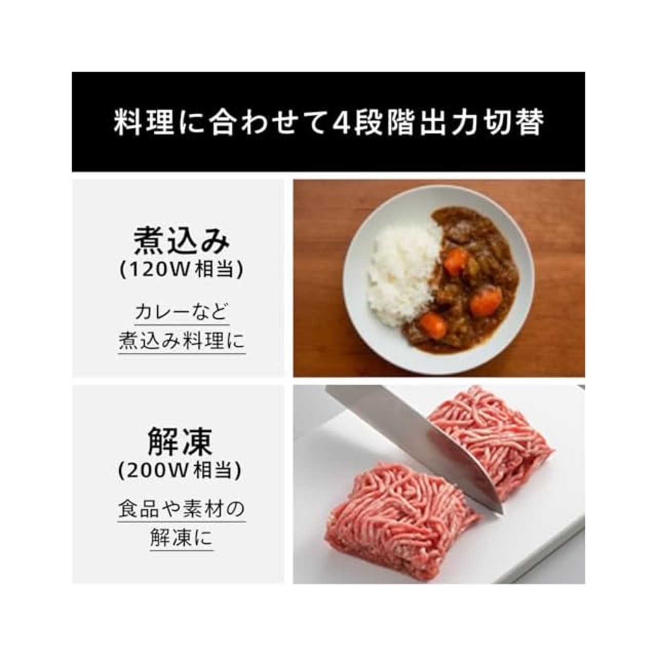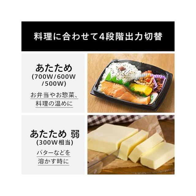 使用:定格高周波出力:700W、出力切替:6段階(700W/600W/500W/弱/解凍/煮込み)、タイマー:15分