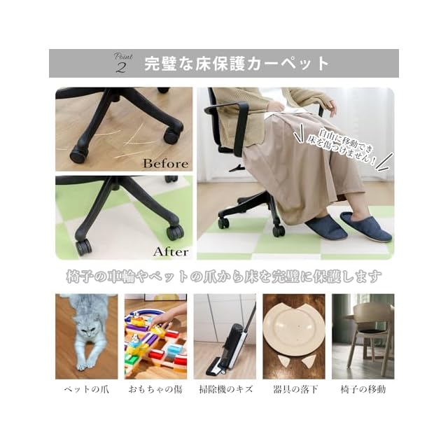 【床暖房対応・使いやすい】リビングや寝室はもちろん、キッチンのペット カーペット、玄関の汚れ防止マット、廊下の防音マットとしても使用可能。タイルカーペットは簡単にカスタマイズでき、どんな部屋のレイアウトにも対応します。さらに、地暖房間でも使えるので、寒い季節にも快適です