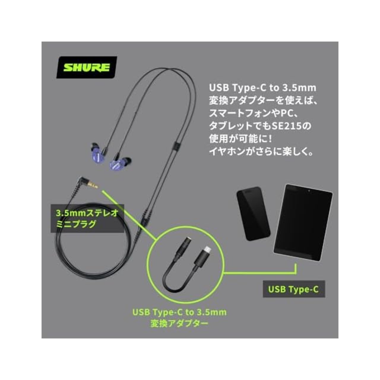 ✅【3.5mmジャック非搭載のデバイスでも利用可能】USB Type-C to 3.5mm 変換アダプターを使えば、3.5mmジャックがないUSB Type-C対応のPCやスマートフォン、タブレットでもSE215をご利用いただけます。※変換アダプターは別売りです。