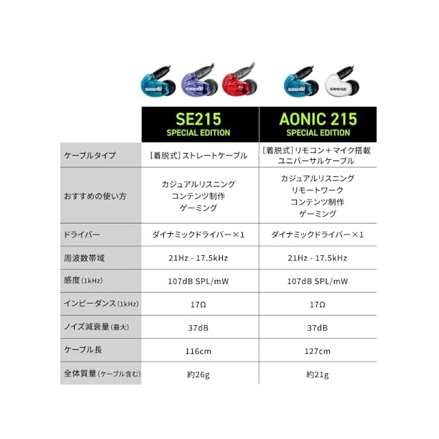 商品名:SHURE シュア イヤホン AONIC 215 有線 マイク付き SE215DYWH+UNI-A ホワイト 高遮音性 ゲーム ゲーミング スペシャルエディション カナル型 ワイヤレス変換可(別売) MMCX リケーブル プロ仕様 低音強化 配信 音楽 オーディオリスニング レコーディング 録音 楽器 在宅勤務 リモートワーク ケーブル長127 cm 【国内正規品/メーカー2年】