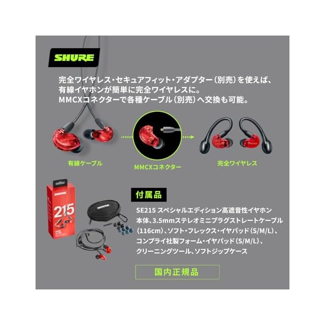 商品名:【VGP 殿堂入り金賞】SHURE シュア イヤホン 有線 SE215SPE-RD-A レッド 高遮音性 ノイズキャンセリング ゲーム ゲーミング スペシャルエディション カナル型 ワイヤレス変換可(別売) MMCX リケーブル プロ仕様 低音強化 配信 音楽 オーディオリスニング レコーディング 録音 楽器 在宅勤務 リモート ケーブル長116 cm 赤 RED 【国内正規品/メーカー2年】