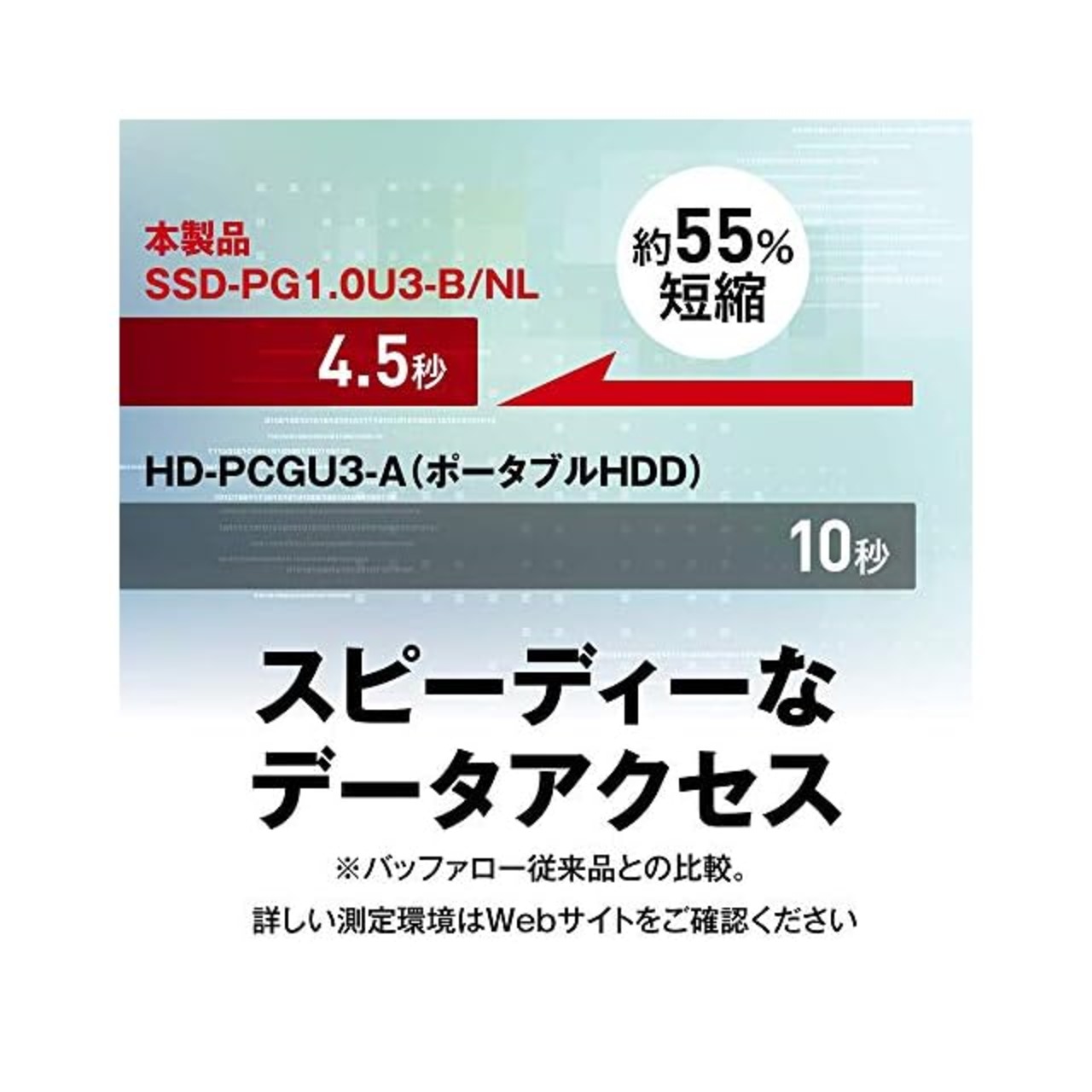 SSDを内蔵しているPCのパフォーマンスを発揮するには、外付けのストレージもSSDが最適です。従来の外付けHDDと比べ、データのコピー速度がグンとアップします。