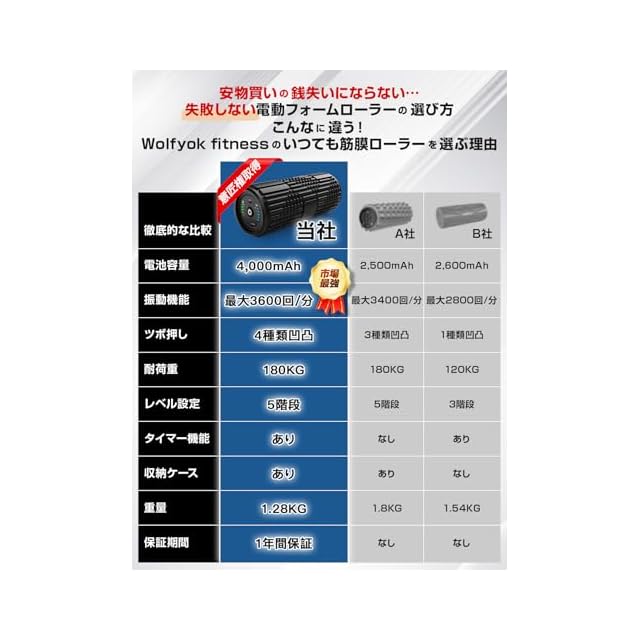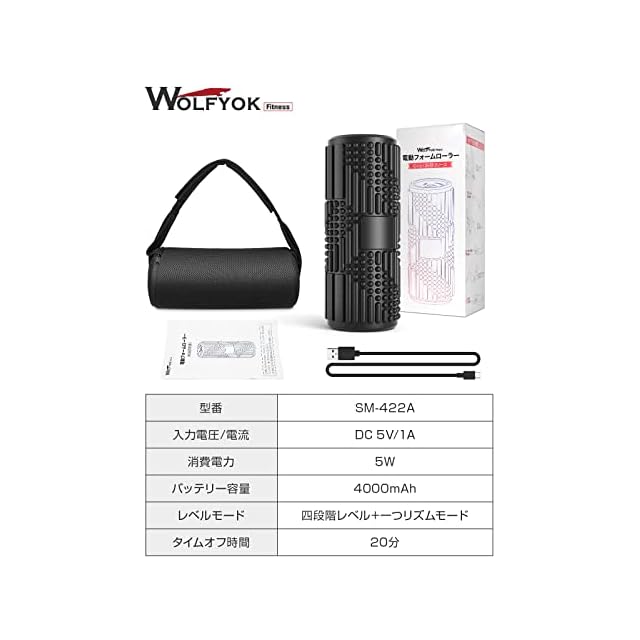 商品名:【国内ブランド】Wolfyok fitness フォームローラー 電動 筋膜リリース ローラー 4000mAh 大容量電池 多種類の凹凸 【意匠権取得】 パワフル振動 筋膜ローラー 振動 猫背 ヨガポール グリッド 多種類の凹凸 ピラティス リラクゼーション 足 腰 肩 首 ストレッチ トレーニング 器具 ウルフヨック フィットネス 収納袋付 プレゼント