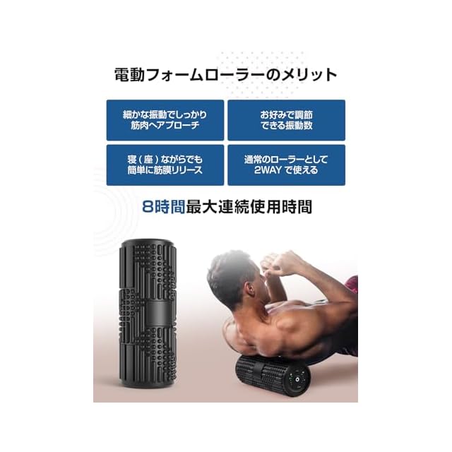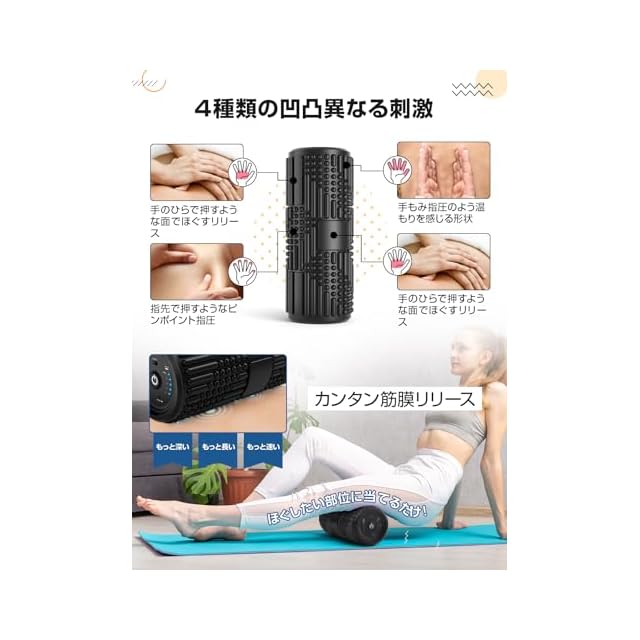 この電動フォームローラーはワンタッチで1000、1800、2700、4000回/毎分の振動強度調整機能を搭載します。筋膜ローラーは優しい振動からパワフル振動まで、お好みや目的に合わせて、 強弱&リズムを調整できます。
