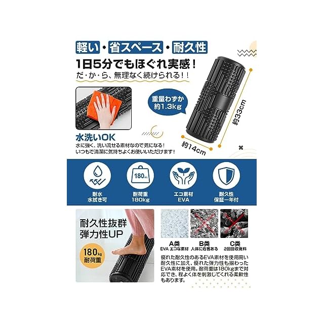 筋膜ローラーは表面に4種類凹凸を配置しました。指先、指のひら、指の腹のようなツボ押しで実際に手を使っているように近づけました。多種類の筋膜リリース方法が可能です。高品質のEVA素材を使用し、丈夫さ、耐久性と柔軟性を兼ね備えて、人体と環境にもやさしいです。