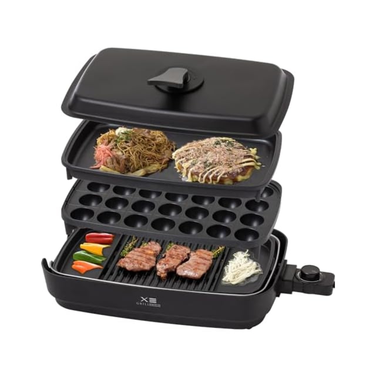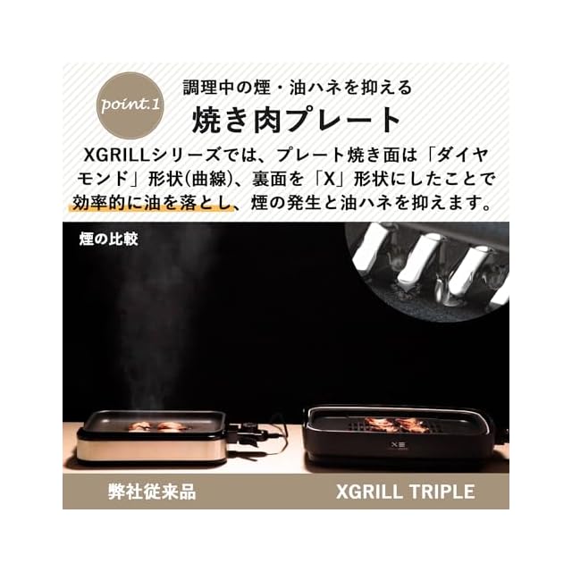 【おうちでお店気分】ご自宅で気軽に焼き肉が楽しめるXGRILLシリーズの第5弾『減煙焼き肉グリル "XGRILL TRIPLE" 』。「“Xカット構造”の焼き肉」「極みのたこ焼き」「平面」3種のプレートがついており、これ1台で手軽に焼き肉が堪能できるほか、お店のような“極みのたこ焼き”や、お好み焼きなど様々な料理を楽しむことができます。