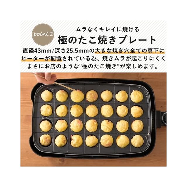 【極のたこ焼きプレート】一般的なたこ焼き器よりも大きい、直径43mm、深さ25.5mmの焼き穴サイズとすることで生地をたくさん入れることができ、ボリュームのあるキレイな丸型に焼き上げます。また、全てのたこ焼き穴の真下にヒーターが配置されるため焼きムラが起こりにくく、さらに、たこ焼きをひっくり返しやすくするための串ガイドも付いています。まさにお店のような"極のたこ焼き”が楽しめます。