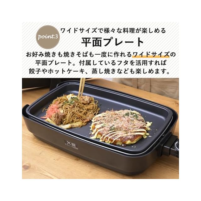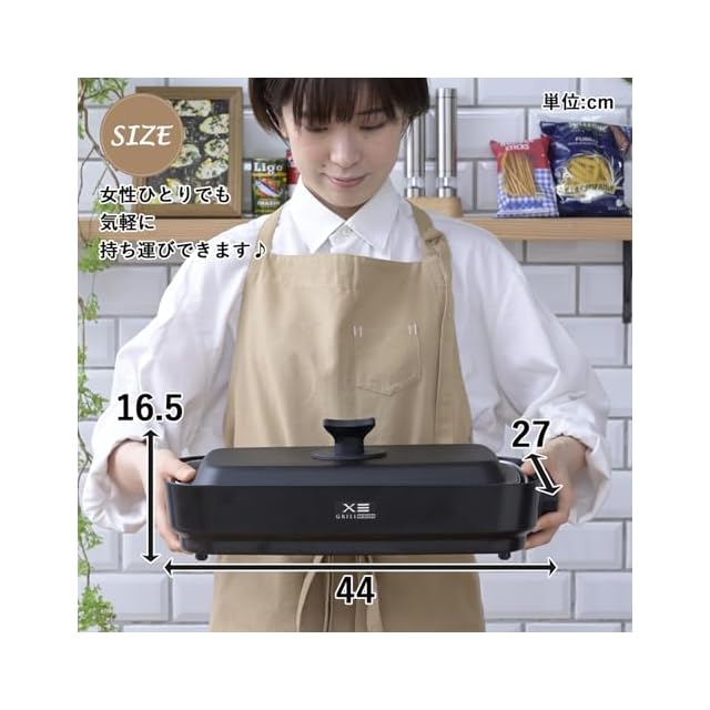 【商品仕様】◇本体サイズ:幅44×奥行27×高さ16.5cm(平面プレート/フタ有り) ◇本体重量:3.2kg(平面プレート/フタ有り) ◇電源:AC100V(50/60Hz) ◇消費電力:1300W ◇温度設定:約80度(保温)~230度 ◇電源コード:約2.2m ◇期間:お買い上げ日より1年間(の範囲については、取扱説明書をご確認ください。(一般家庭用以外(業務用など)に使用された場合の故障及び損傷などは対象外となります))