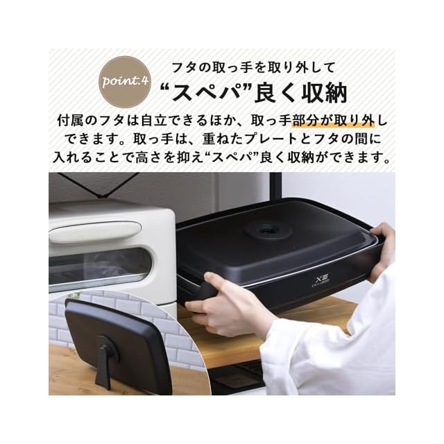 【平面プレート&便利なフタ】平面プレートでは、付属しているフタを活用し、お好み焼きや餃子などの調理が可能です。付属のフタは自立できるほか、収納時の邪魔にならないよう、取っ手部分が取り外しできます。取っ手は、重ねたプレートとフタの間に入れることで“スペパ”良く収納が可能なうえ、紛失する心配もありません。