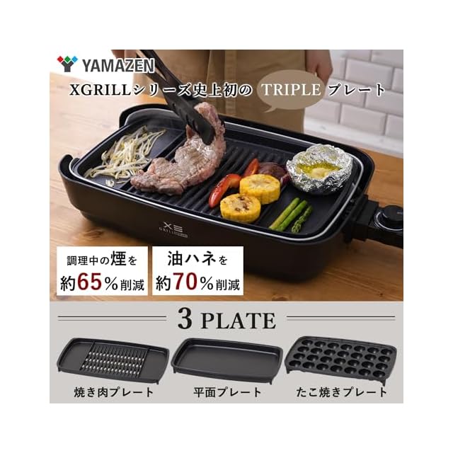 商品名:[山善] 煙の少ない 焼き肉グリル XGRILL TRIPLE 一人暮らし 二人暮らし 「素早く、美味しく焼ける」 ホットプレート 3枚 (焼肉/たこ焼き/平面) 煙約65%カット 温度調節80~230度 プレート着脱可能 YHP-TX130(B)