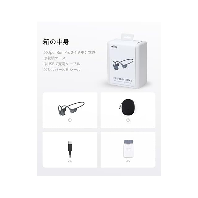 Shokzについて Shokzは、世界的に有名な骨伝導技術を持つオープンイヤーヘッドフォンのリーディングメーカーであり、革新的なデザインと高品質な音響体験を通じて新しいライフスタイルを提案し続けています。 使用シーン Shokzのワイヤレスヘッドフォンは、ウォーキング、通勤、学習、仕事、リモートワーク、会議、スポーツ、ランニング、サイクリング、ヨガ、テニス、ハンズフリー通話、テレコミューティング、ウェブ会議、モバイルゲーム、通勤、リモートワークなど、さまざまなシーンで輝きます。誕生日、新年、クリスマスギフトに最適です。 製品仕様 材料:シリコン、プラスチック、ニッケルチタン合金 Bluetoothバージョン:Bluetooth 5.3 充電時間:60分 1回の充電での使用時間:最大12時間のバッテリー寿命 充電方法:USB Type-C 同梱物 OpenRun Pro 2イヤホン本体*1、収納ケース*1、USB-C充電ケーブル *1、シルバー反射シール *1、書*1、ユーザガイド*1