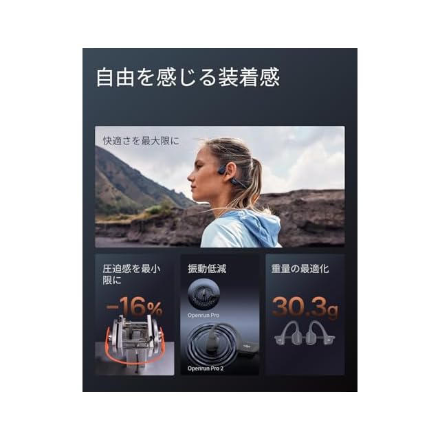 最適化されたフィット感:OpenRun Pro 2は、厳しい環境でも安心してご使用いただけるようにデザインされています。人間工学に基づいたイヤーフックと一体型フレームが、ずれることなく安全で快適なフィット感を実現します。圧力を均等に分散する広めの接触面と洗練されたバンド設計により、長時間の使用でも心地よさが持続し、プレイリストのように快適な着け心地が続きます。