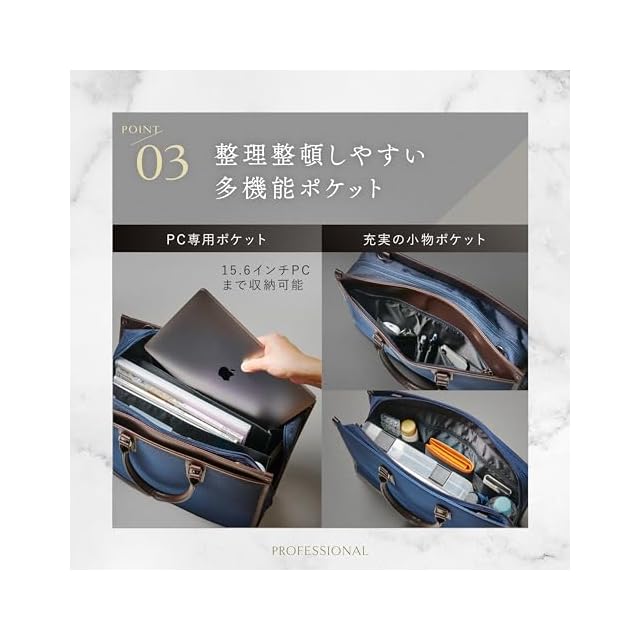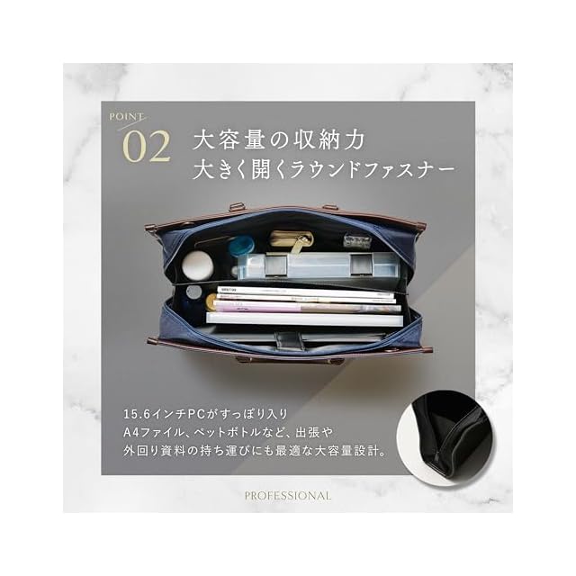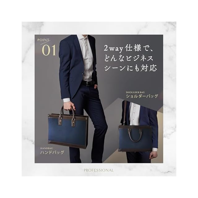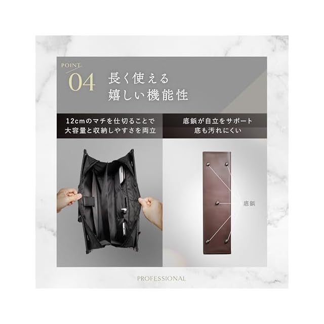 【タフな現場でこそ、真価を発揮】揺るぎない自立機能と撥水加工 外回りや顧客訪問が多い営業職にとって、バッグの信頼性は不可欠です。 盤石の自立機能:底鋲としっかりした底紙が、多くの荷物の重さを支え、どんな場所でも美しく自立します。 突然の雨にも動じない撥水加工:ゲリラ豪雨に遭遇しても、あなたの大切なPCや契約書類を水濡れから守り抜きます。