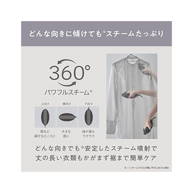 360°パワフルスチーム搭載で、どんな向きで使っても(※ハンガーにかけた衣類に平行に向けた場合)スチームたっぷり。