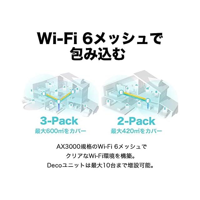 [特徴] 広いおウチでも、たくさん端末があっても、もう大丈夫。広範囲をムラなく包み込む次世代Wi-Fi6メッシュで、おウチのWi-Fiを快適にしよう。2ユニットパック。