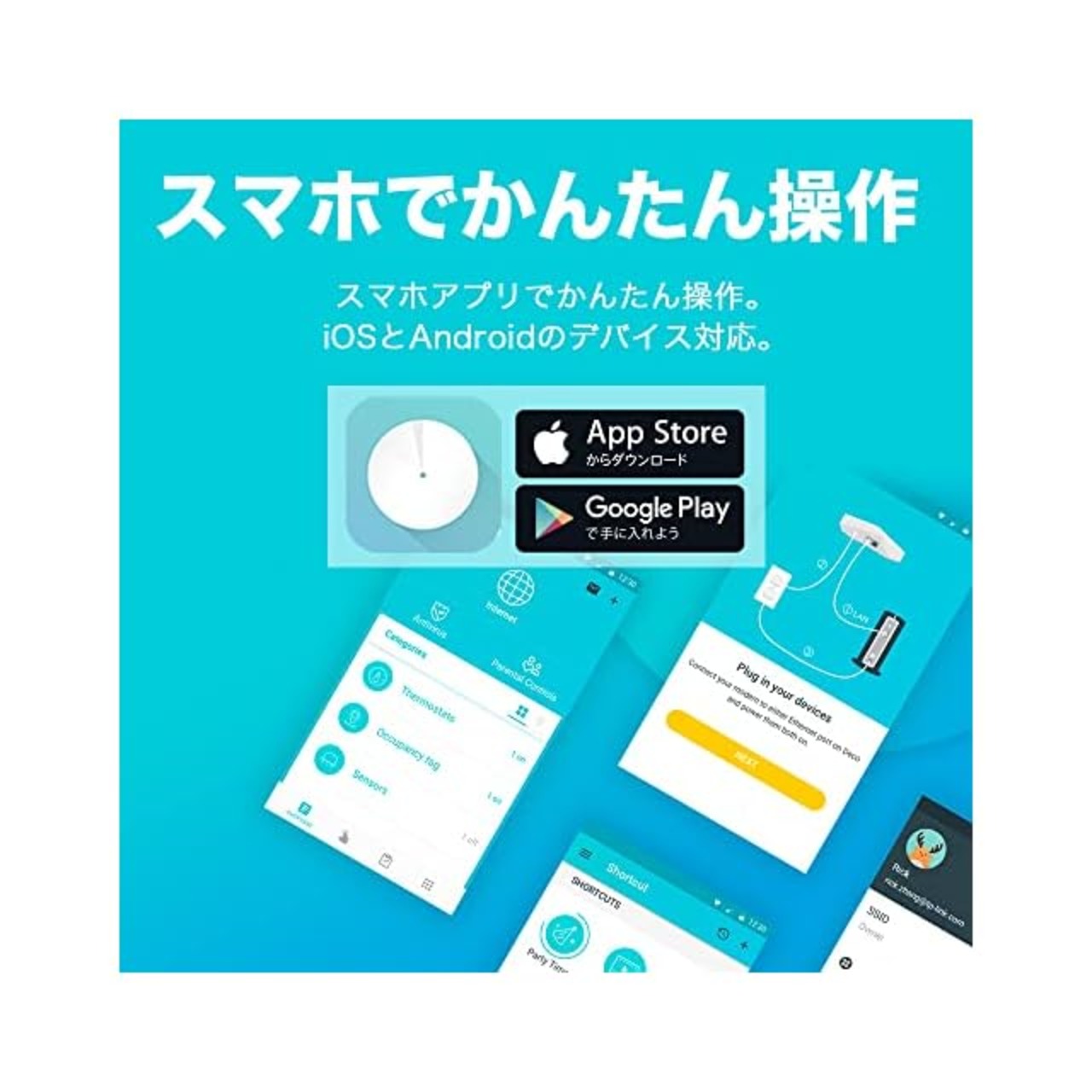 [かんたん設定] Decoを箱から出してアプリをインストールしたら、あとは画面の表示通りに進めるだけ。数分で設定完了です。