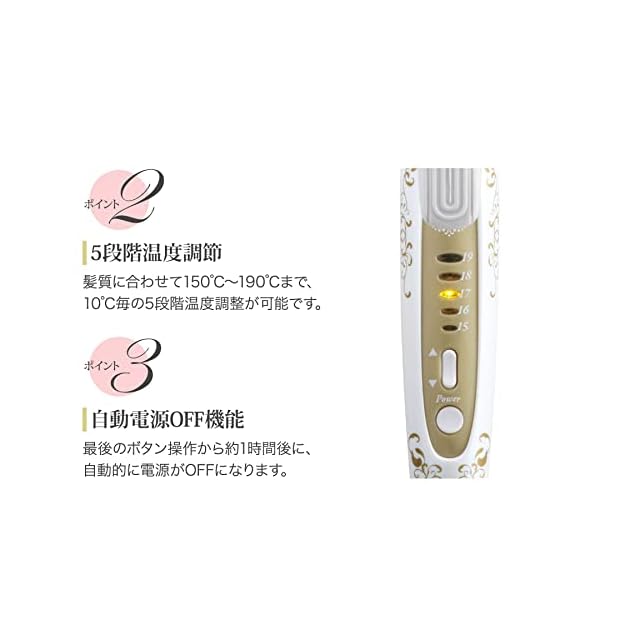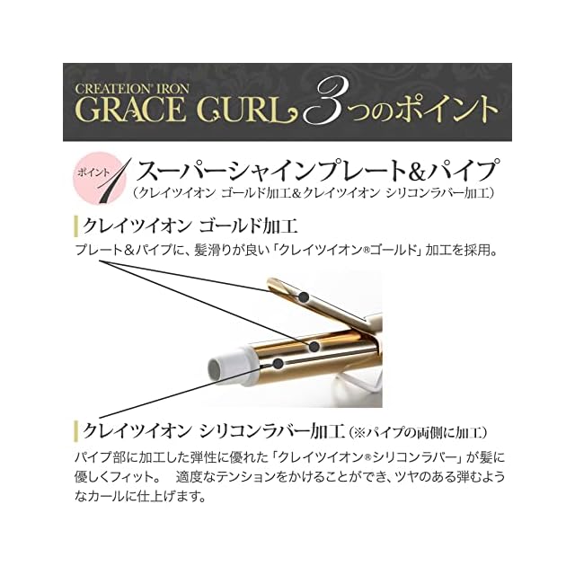 憧れの「キレイ」を叶える 輝く上質カールに。<br> <br> スーパーシャインプレート&パイプ<br> 「クレイツイオンゴールド加工」 プレート&パイプに髪滑りが良い 「クレイツイオンゴールド加工」を採用。<br> <br> 「クレイツイオンシリコンラバー加工」<br> パイプ部に加工した弾性に優れた 「クレイツイオンシリコンラバー」が 髪に優しくフィット。<br> 適度なテンションをかけることができ ツヤのある弾むようなカールに仕上げます。<br> <br> 5段階温度調節<br> 髪質にあわせて150℃~190℃まで 10℃ごとの5段階温度調節が可能です。<br> <br> 自動電源OFF機能<br> 最後のボタン操作から1時間後に、 自動的に電源がOFFになります。<br> <br> 電源がAC100V~単相240V なので 海外でも使用できます!