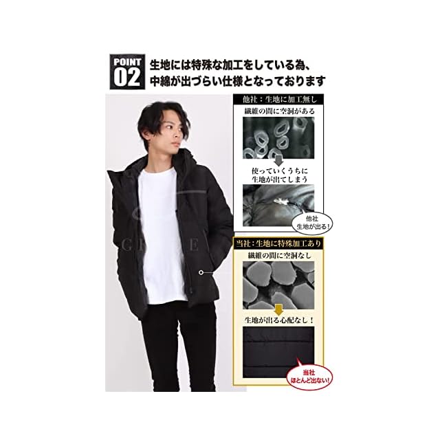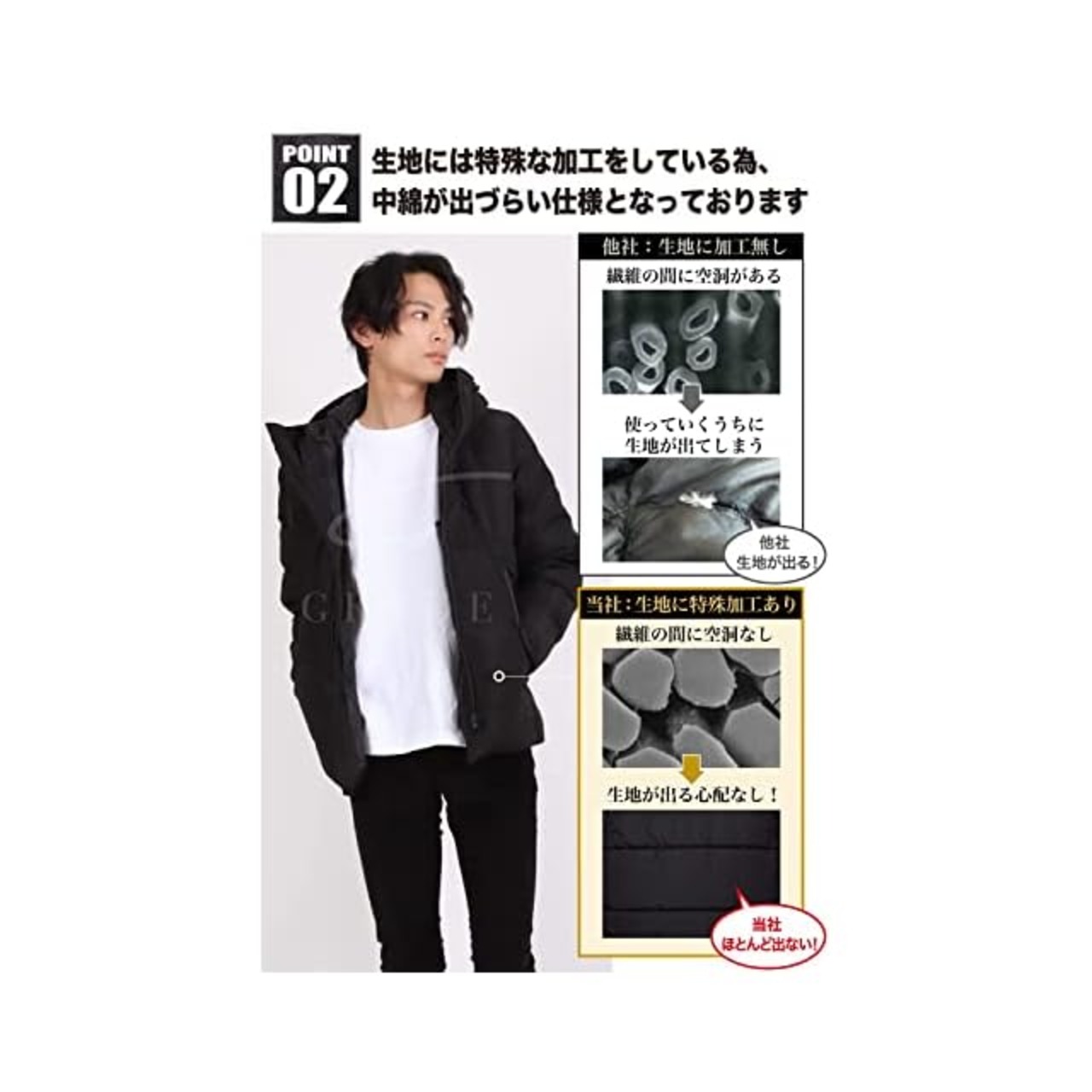 2、『中綿の出ない加工』生地に特殊な加工をすることで中綿が出にくい構造となっております。