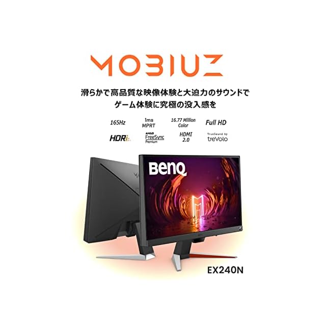 商品名:ベンキュージャパン BenQ MOBIUZ EX240N ゲーミングモニター 23.8インチ フルHD/VA/応答速度(MPRT)1ms/165Hz/HDRi/treVoloスピーカー/FreeSync Premium/Black eQualizer/輝度自動調整機能(B.I.+)搭載/ブルーライト軽減/フリッカーフリー 台湾メーカー