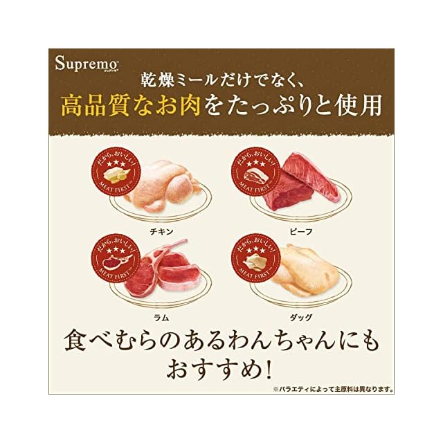 愛犬の体に必要なアミノ酸をバランスよく含むチキン・ビーフ・ラム・ダックなどの肉を第一主原料に使用し、おいしさをそのまま封じ込めました。