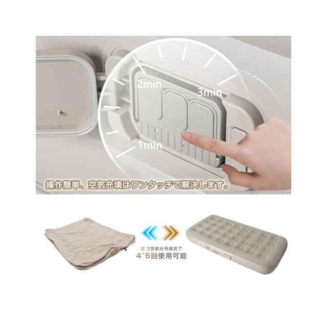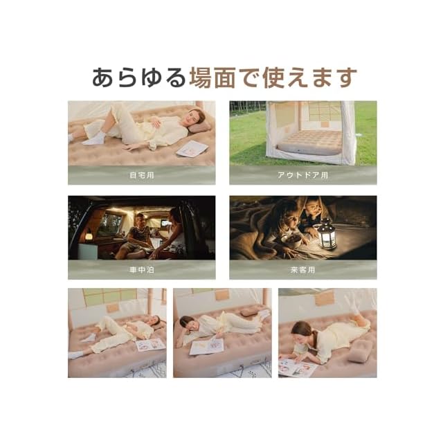 【高性能内蔵電動ポンプど3種類口付き】 エアーマットは電動ポンプ内蔵、別途購入は不要。その上、他社と異なり、本製品の空気入りポンプは取り出してキャンプライト照明として使用することができ、エアクッション枕など他のキャンプ用品にも使用することができます。さまざまな製品に対応できる3サイズの口を用意しています。