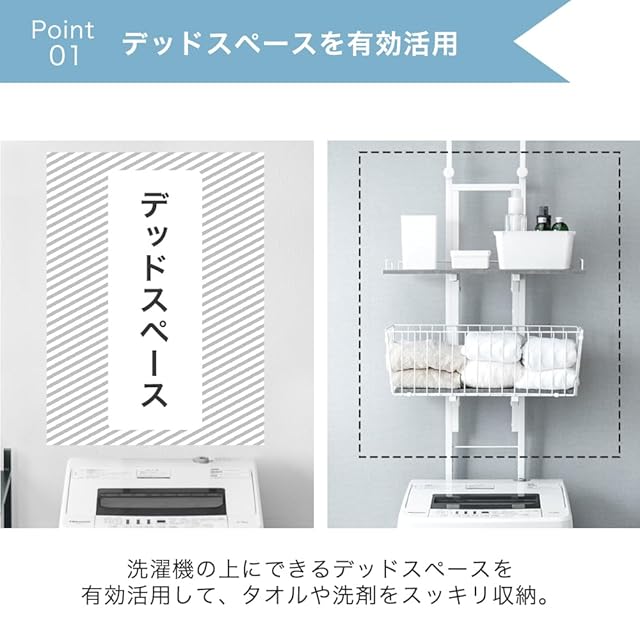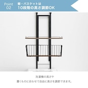 【スタッフのおすすめポイント】<br> ・デッドスペースを有効活用!突っ張り式<br> ・タオルや洗濯物を入れるのに便利なバスケット付き<br> ・幅60cmのスリム設計<br> ・棚板・バスケットは9段階高さ調節OK<br> ・2ステップで設置ラクラク!<br> ・防水パンの上にも設置可能