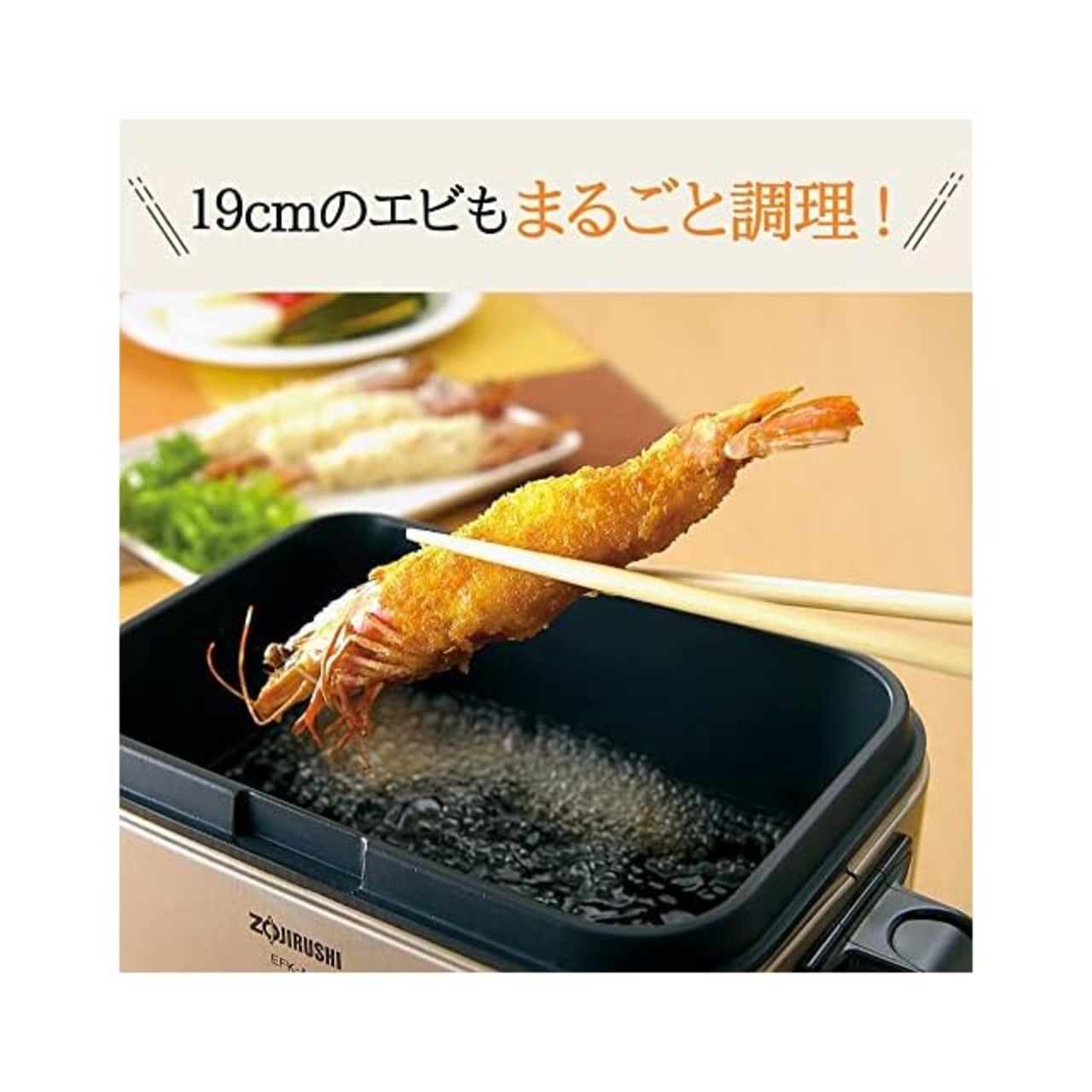 19cmまでの大きなエビもまるごと調理が可能な電気フライヤーです。