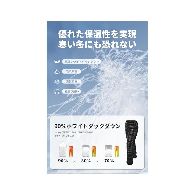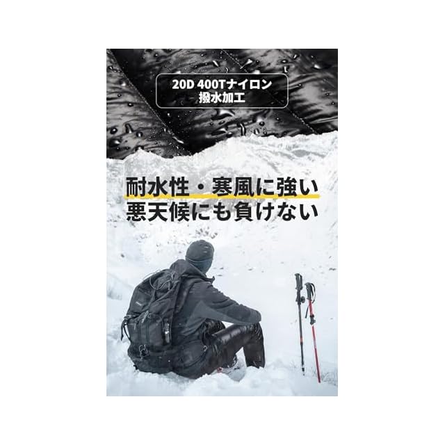 【800FP高級ダウン】インナーには800FP(保温性)相当の高品質ダウンを使用しています。軽量なダウン素材を使用しており、ずっと着ていても快適な着心地です。表地は厳密な20D 400Tナイロンを採用、防水機能を持ち同時に耐久性もあり、羽毛の漏れに防止することができます。