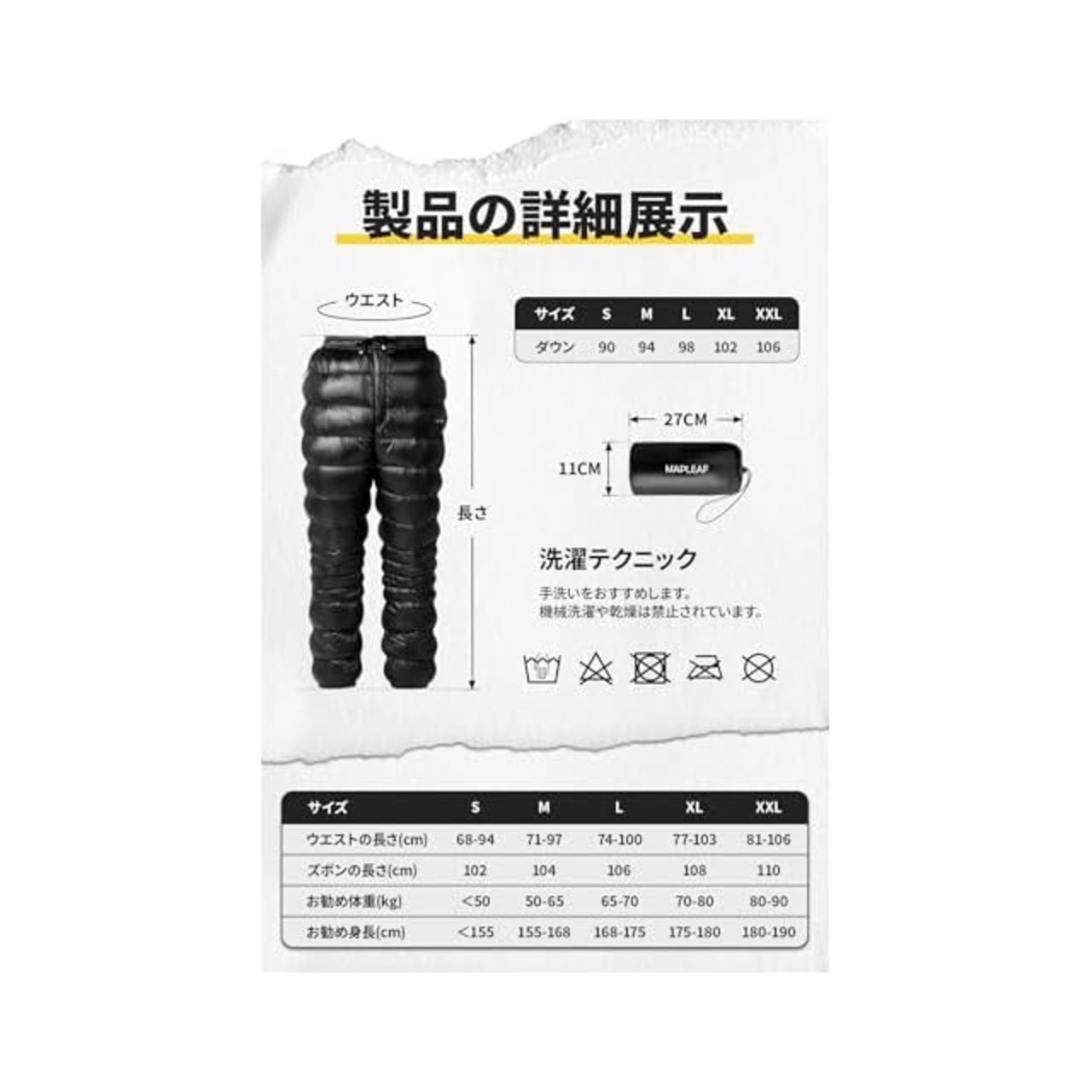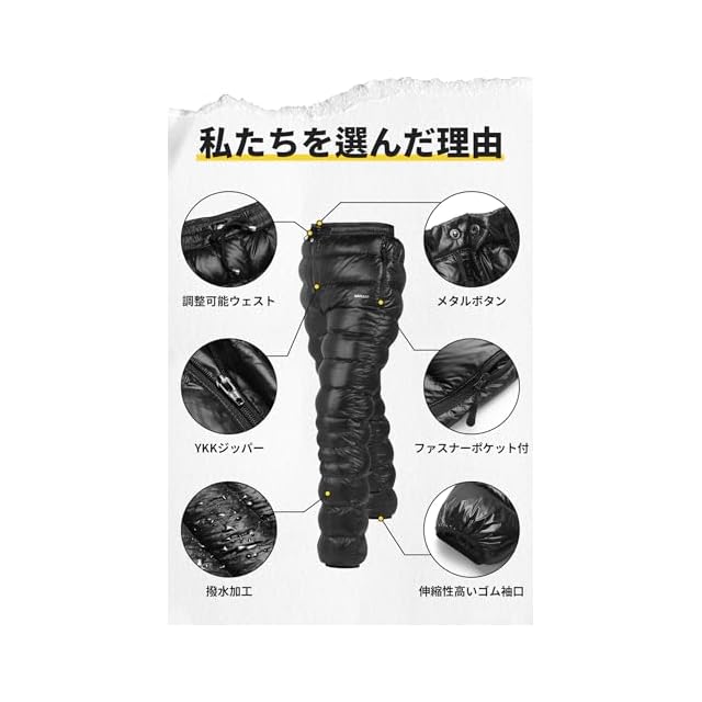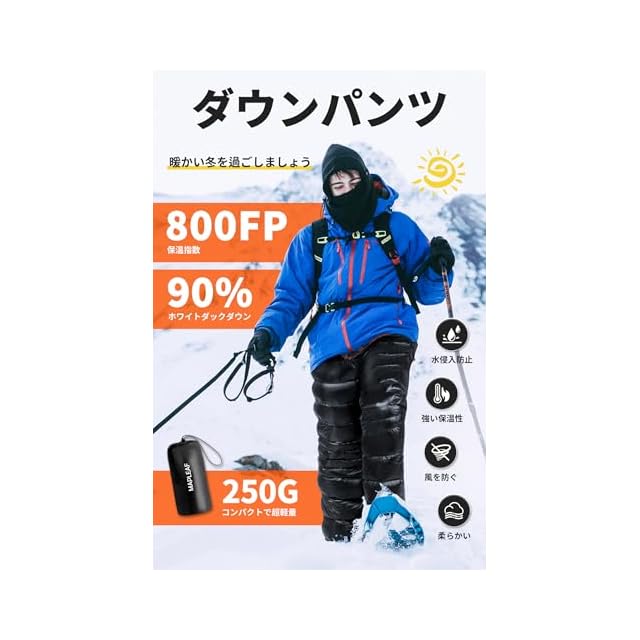 商品名:[Mapleaf] ダウンパンツ 防寒 メンズ レディース 冬登山 超軽量 800FP ボトムス 前開き 暖パンツ 冬服 スキー ゴルフ アウトドア用 作業用 コンパクト 撥水 防風 保温 5℃~-15℃ 肌触り良い 男性 女性 収納袋 ファスナーポケット付