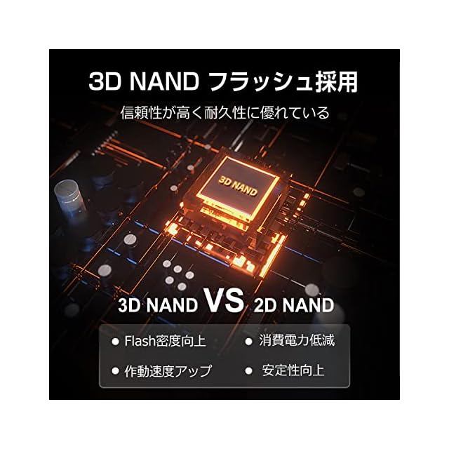 特徴:3D NANDフラッシュメモリの採用と、S.M.A.R.T.機能、不良ブロック管理(BBM)、RAIDとLDPC機能、TRIM機能の搭載で 性能と耐用寿命は大幅に向上しました。