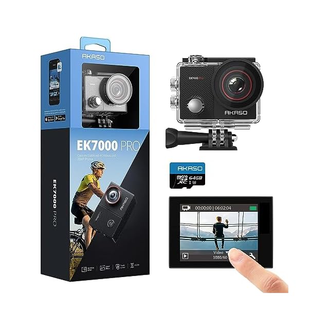 商品名:AKASO EK7000 Pro 4K アクションカメラ + 64GBメモリカード 2000万画素 タッチパネル式 Type-C外部マイク対応 手ブレ補正 WIFI搭載 広角レンズ 40m防水 水中カメラ HDMI出力 スポーツカメラ リモコン付き 2つ1350mAhバッテリー 豊富なアクセサリー ウェアラブルカメラ