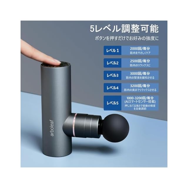 【5段階強力振動&自動モード付き】レベル1~4は手動モードです。ワンタッチで2000、2500、3000、3200回/毎分の振動強度調整機能を搭載します。レベル5は自動モードし、AIスマートセンサーを搭載しており、筋肉に押し当てる強さに応じて、1000-3000回/毎分の振動の頻度を自動調節します。ボタン操作などは一切不要です。